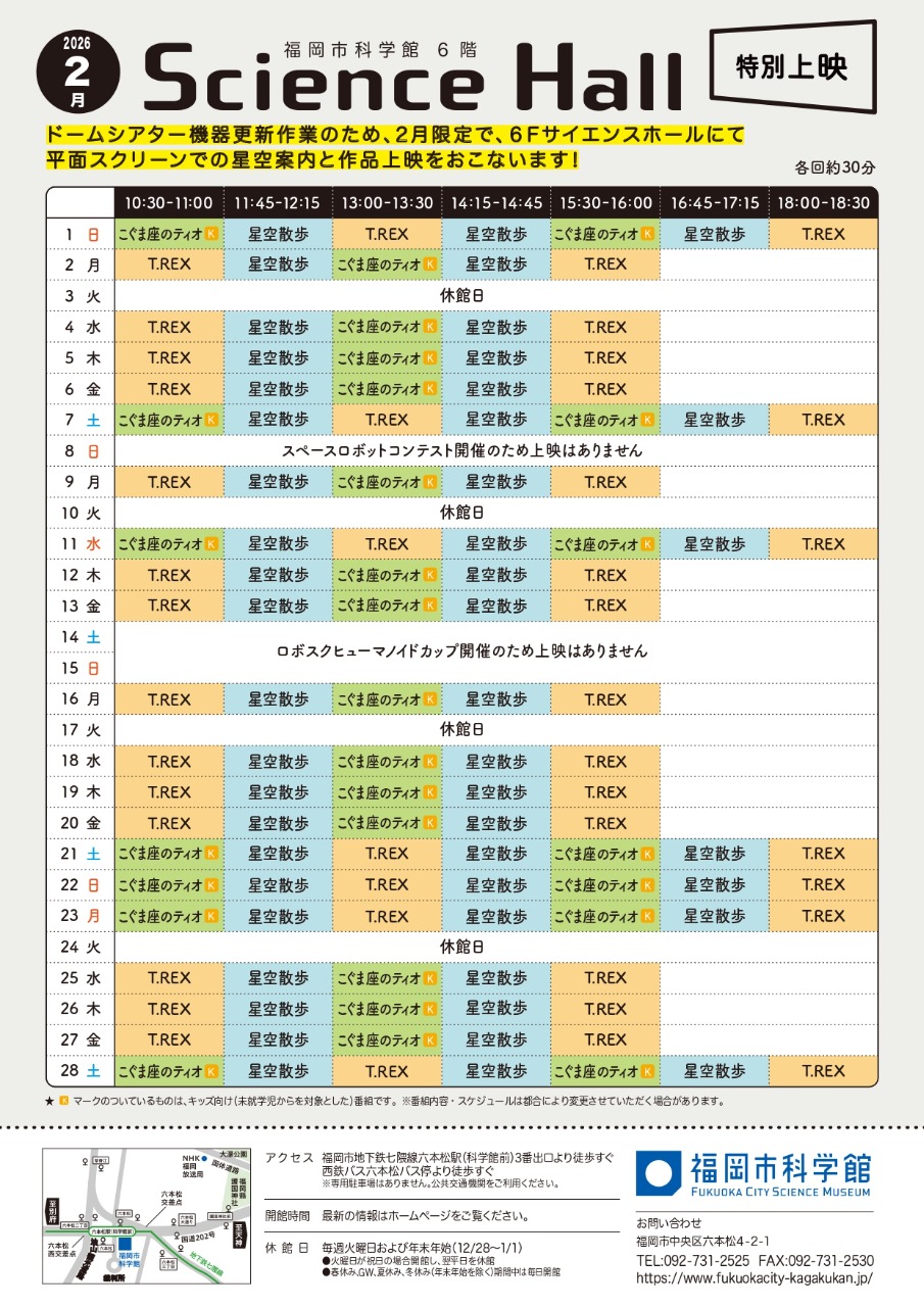 福岡市科学館では、 2026年1月14日(水曜日)から3月23日(月曜日) の間、ドームシアター(プラネタリウム)投映を休止いたします。