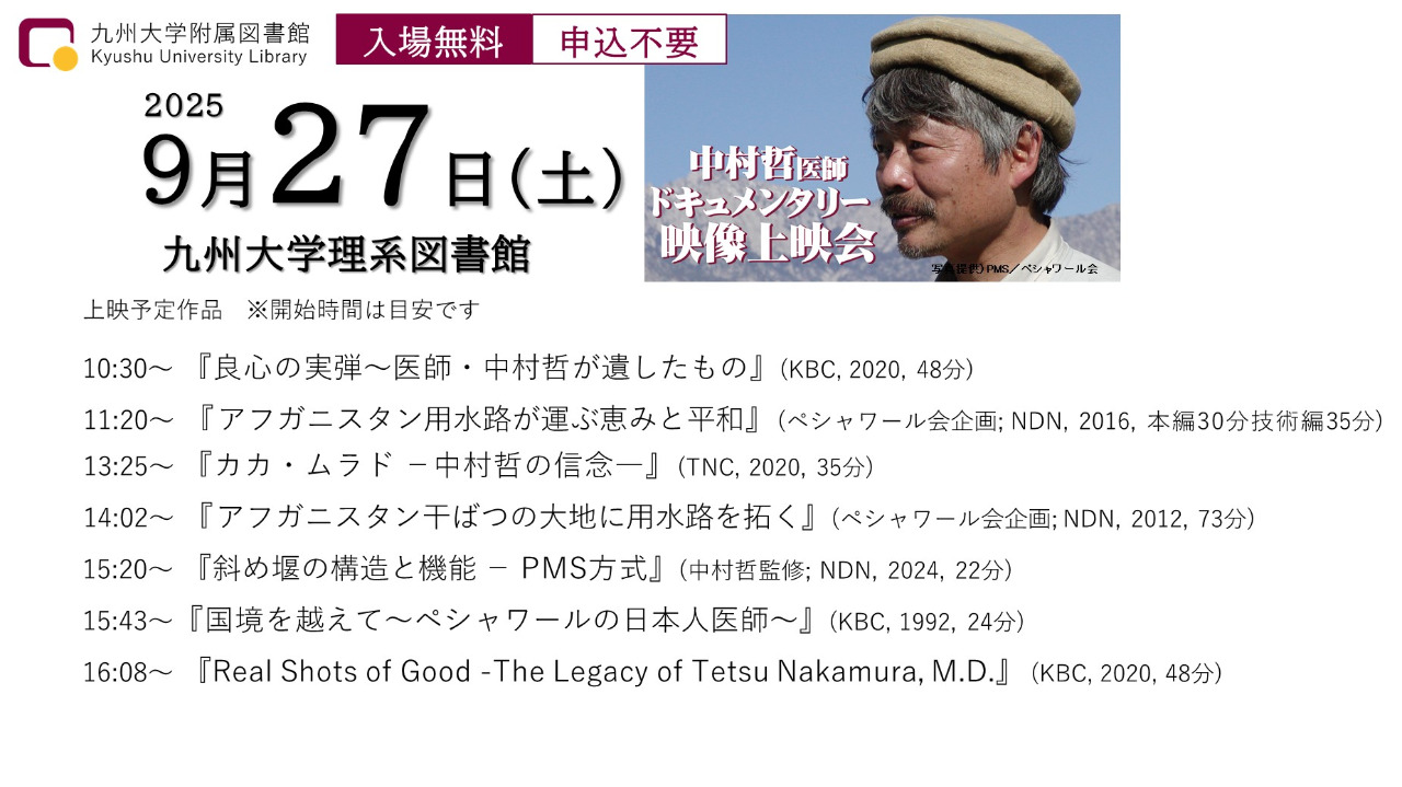 | 主催者 | 九州大学附属図書館/中村哲先生の志を次世代に継承する九大プロジェクト |