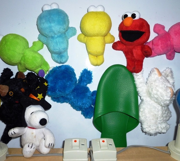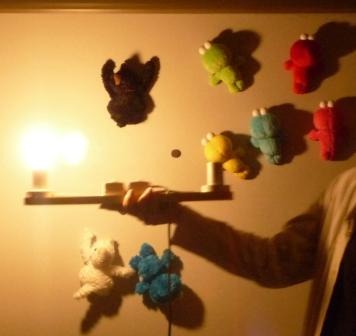 赤い光の中で、いろいろな色のぬいぐるみを見ると、ちょっとふしぎな感じです。