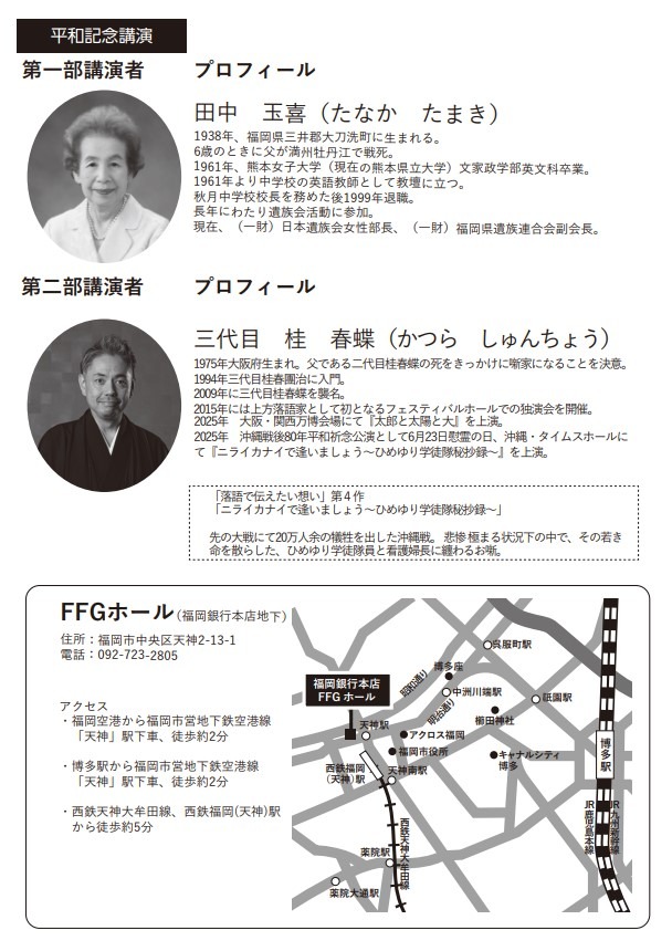 平和記念講演では、戦時下を生きた(一財)福岡県遺族連合会副会長の田中玉喜さんが「平和への想い」を語ります。また、落語家 三代目 桂春蝶さんが落語で伝えたい想いシリーズ四作目「ニライカナイで逢いましょう〜ひめゆり学徒隊秘抄録〜」を披露します。