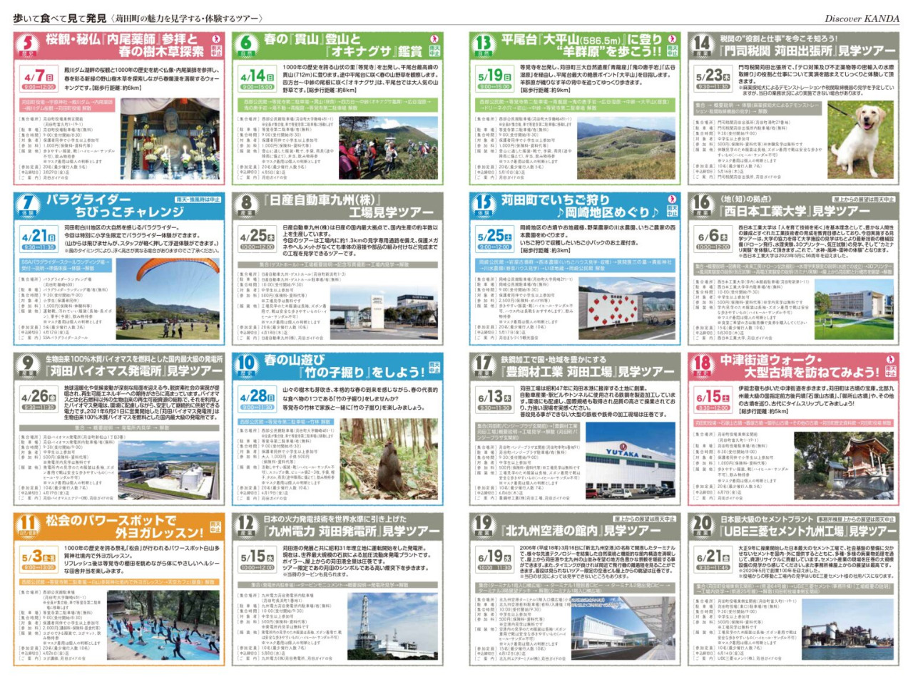 | 特記事項 | 【イベント開催期間】 3月24日(日曜日)~6月21日(金曜日) 期間内に20種類のイベントを開催予定! ※各イベントの開催日は異なります。詳細は関連リンク先をご参考ください。 【申込方法】 電話(TEL:093-434-5560)のみで受付 ※詳細は関連リンク先をご参考ください。 |