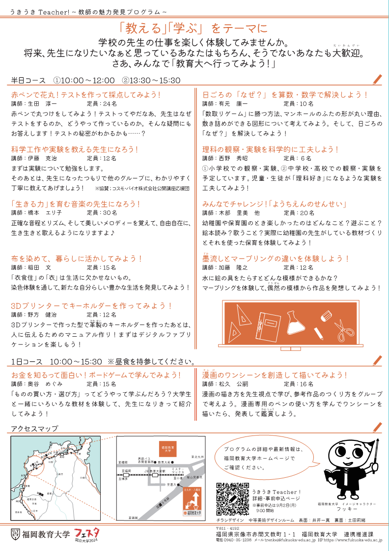 | お問い合わせ | 国立大学法人福岡教育大学 連携推進課 社会連携担当(メール:trenkei@fukuoka-edu.ac.jp 電話:0940-35-1238) |