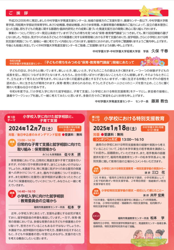 【中村学園大学・中村学園大学短期大学部】子どもの育ちをみつめる保育・教育専門講座「小学校入学に向けた就学相談と、子育て支援」