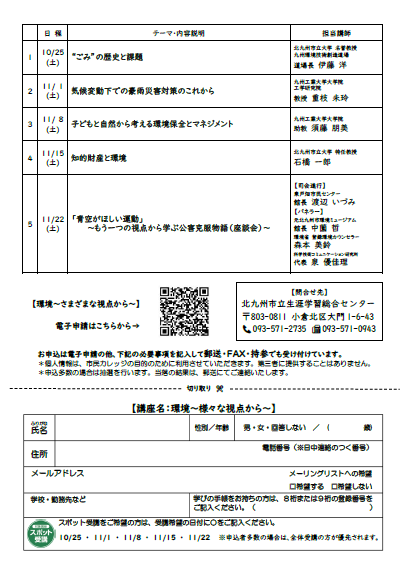 | 関連リンク | 講座の詳細(外部リンク) お申し込みはこちら(外部リンク) 北九州市民カレッジ(北九州市のホームページへ移動します)(外部リンク) |