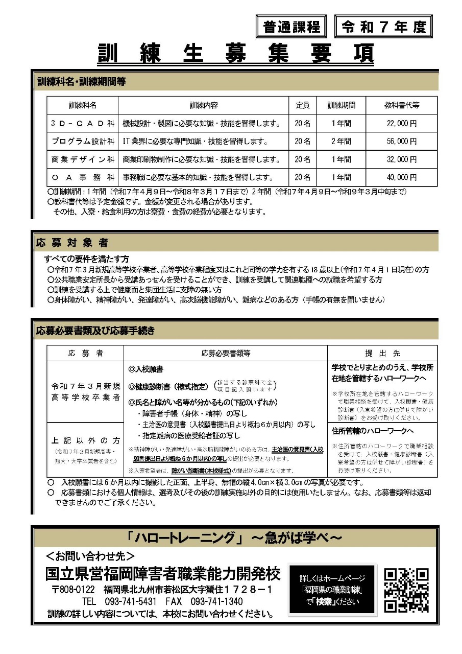【福岡障害者職業能力開発校】令和7年度訓練生募集(普通課程)