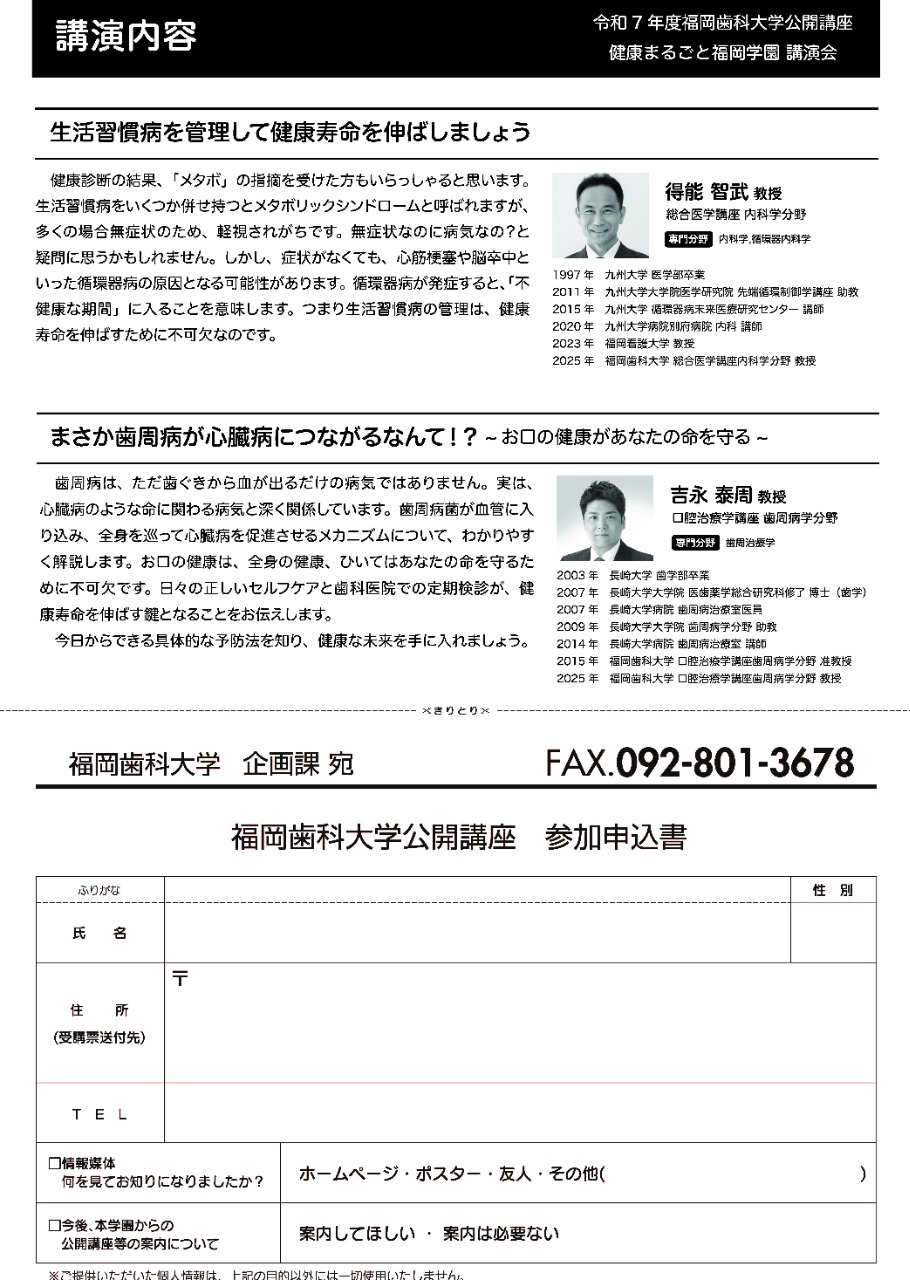 令和7年度福岡歯科大学公開講座 「歯ぐきから始まる健康づくり 〜歯周病が動脈硬化と関係あるって本当?〜」