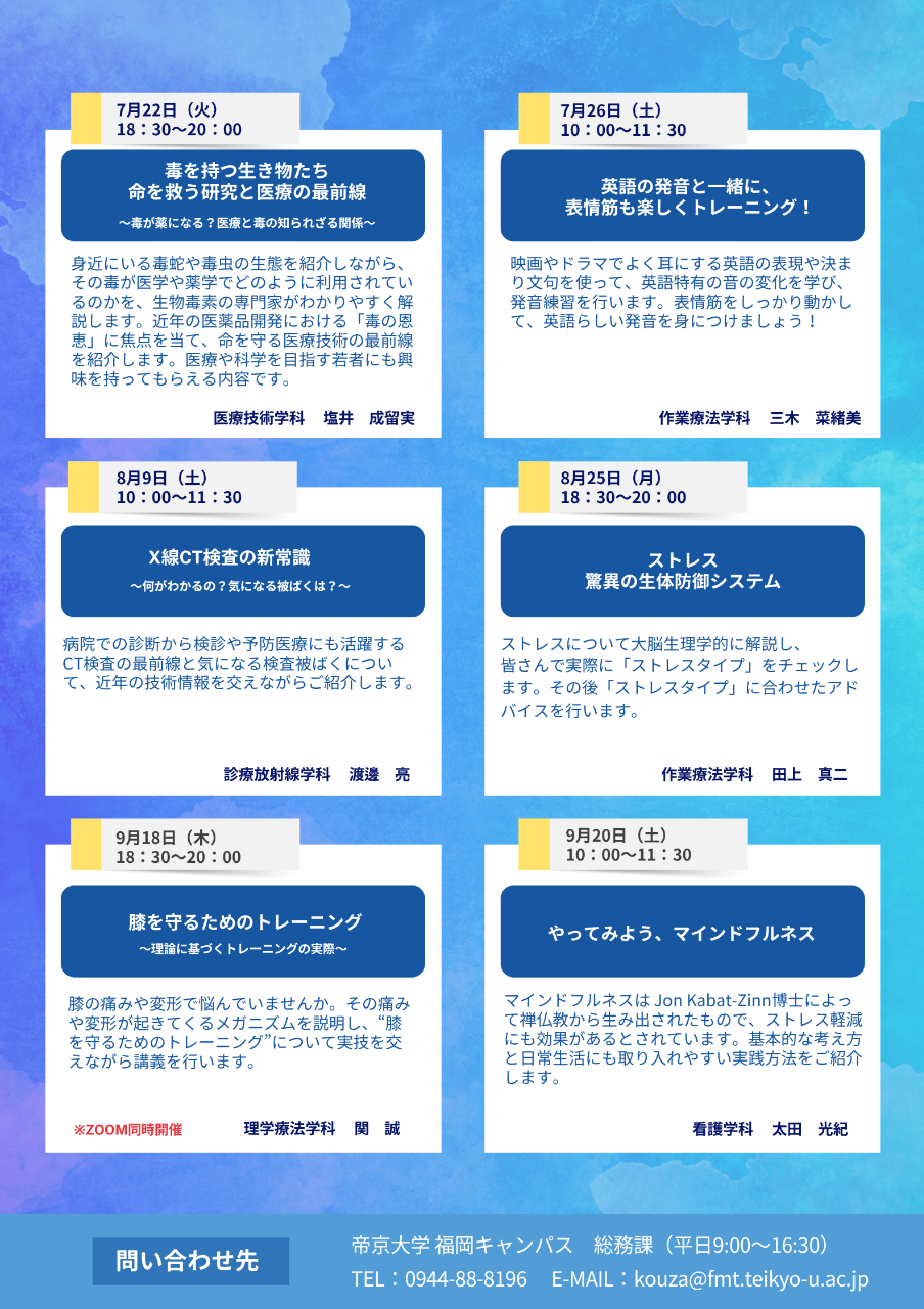 | お問い合わせ | 帝京大学福岡キャンパス総務課 (TEL:0944-88-8196 FAX:0944-55-7703 E-MAIL:kouza@fmt.teikyo-u.ac.jp) |