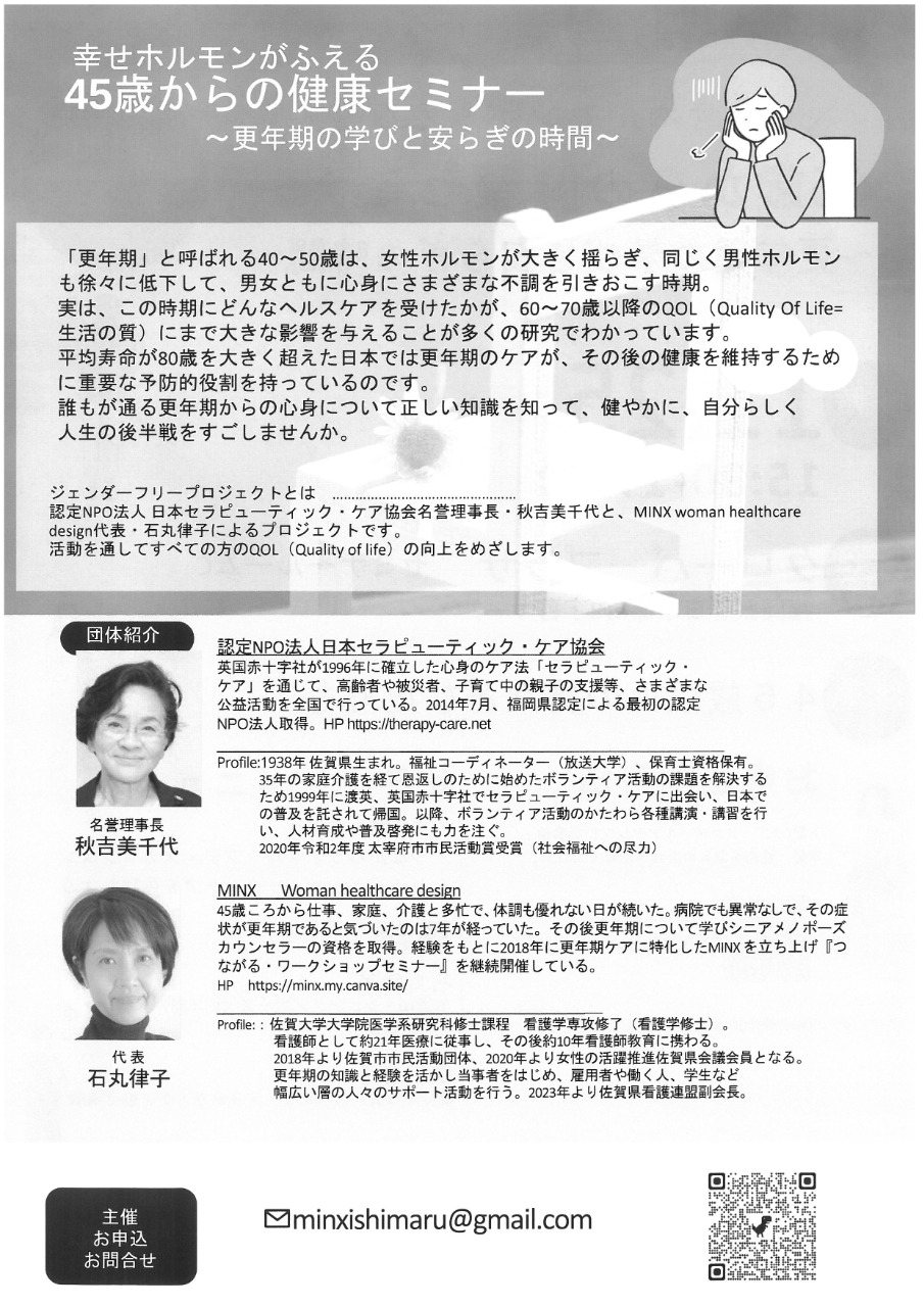 このセミナーでは、看護師・メノポーズ(更年期)カウンセラーのMINX代表・石丸律子さんから更年期についての最新知識を、当協会の鶴田講師からは手のぬくもりで癒されるイギリス生まれの心身のケア法「セラピューティック・ケア」をご紹介します。