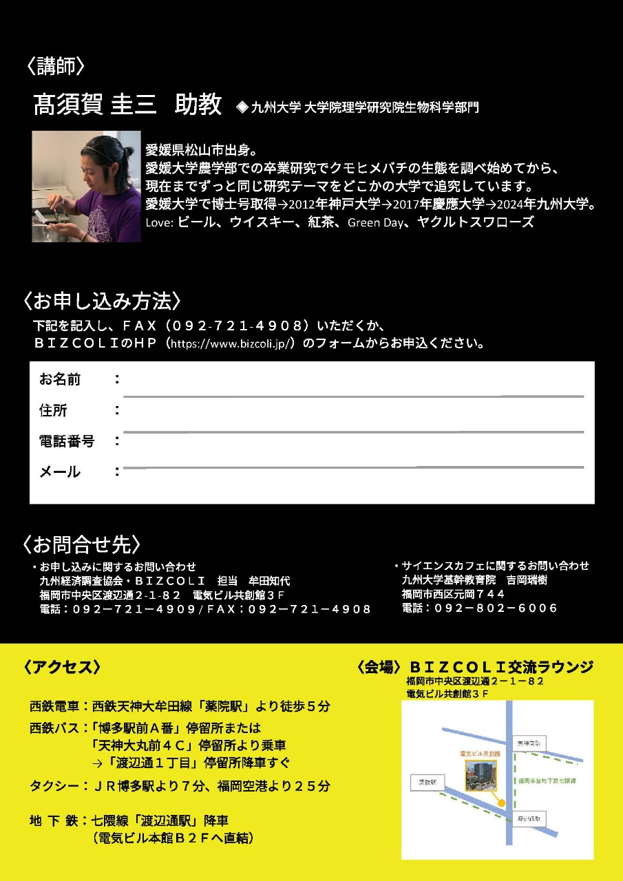 お問い合わせ ■お申し込みに関するお問い合わせ 九州経済調査協会・BIZCOLI  福岡市中央区渡辺通2-1-82 電気ビル共創館3F  電話:092-721-4909 / FAX:092-721-4908  担当 牟田                    ■サイエンスカフェに関するお問い合わせ  九州大学基幹教育院 吉岡瑞樹  電話:092-802-6006
