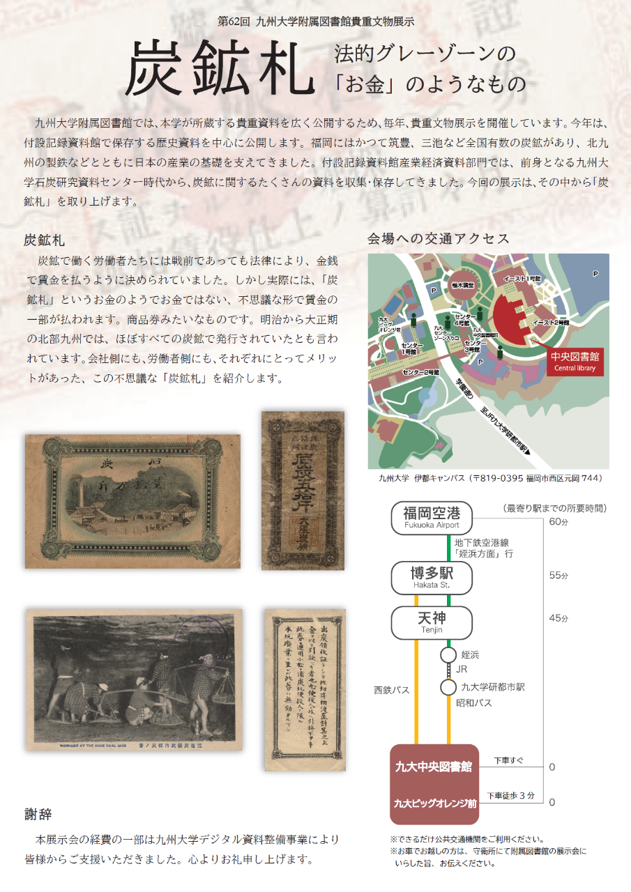 【九州大学附属図書館】講演会「江戸・明治・大正・昭和と炭鉱札 ―記録資料館の炭鉱札を中心にして」