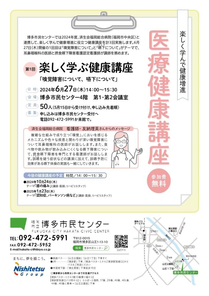 【NEXT博多市民センター共同企業体】第1回楽しく学ぶ健康講座「味覚障害について、嚥下について」
