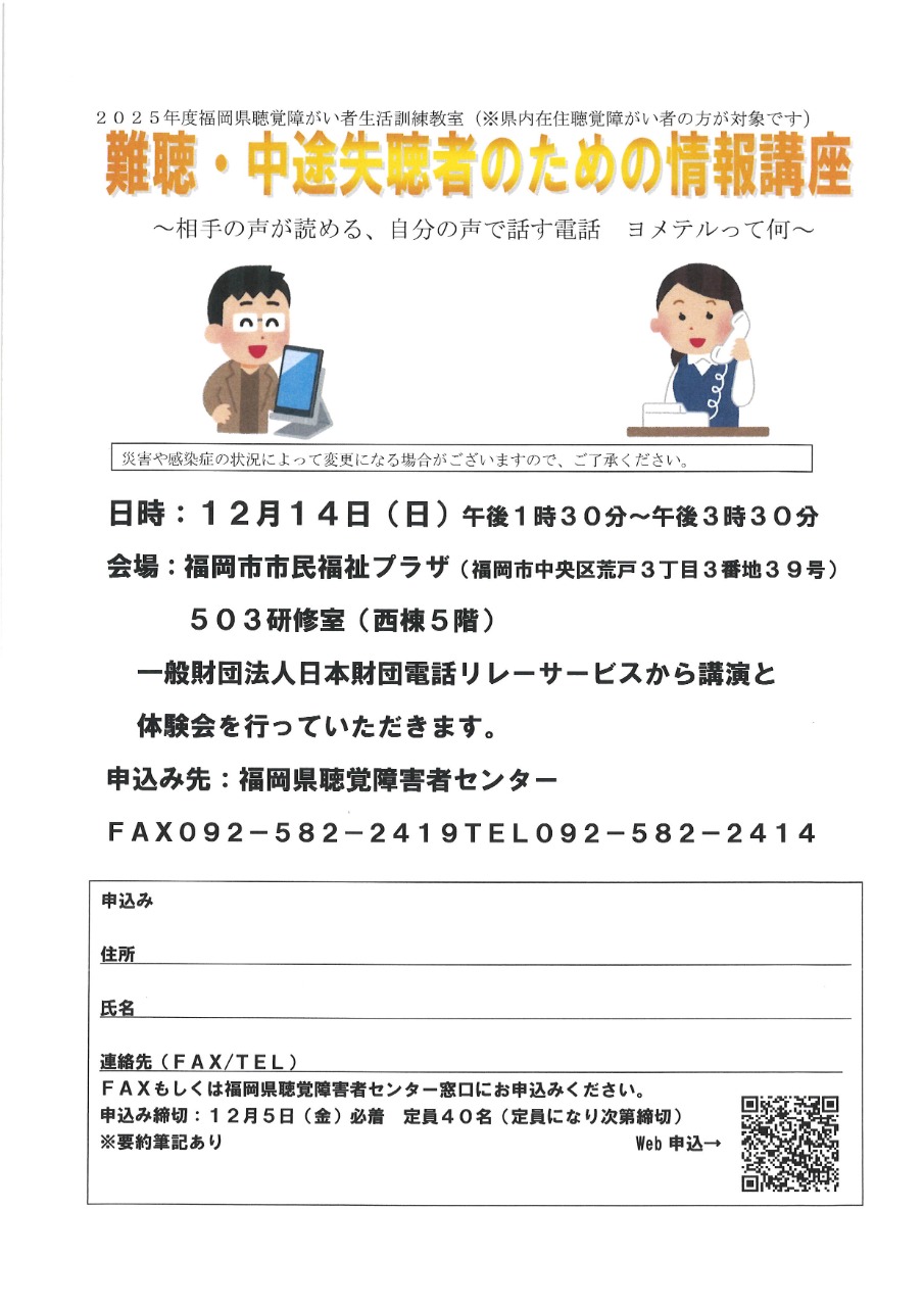 【福岡県聴覚障害者センター】2025年度第7回福岡県聴覚障がい者生活訓練教室 ~